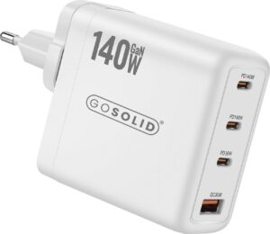 Chargeur GO SOLID! 140W compact avec 4 ports (3× USB-C, 1× USB-A). Charge rapide avec Power Delivery et compatibilité Quick Charge pour smartphones, tablettes et ordinateurs portables. Répartition intelligente de la puissance pour charger plusieurs appareils simultanément à vitesse optimale. Protections contre les surintensités, surtensions et courts-circuits pour une charge sûre. Design portable et léger, idéal à la maison, au bureau et en voyage. Compatible avec Apple, Samsung, Google, Huawei, Xiaomi, OnePlus, Dell, HP et Lenovo.