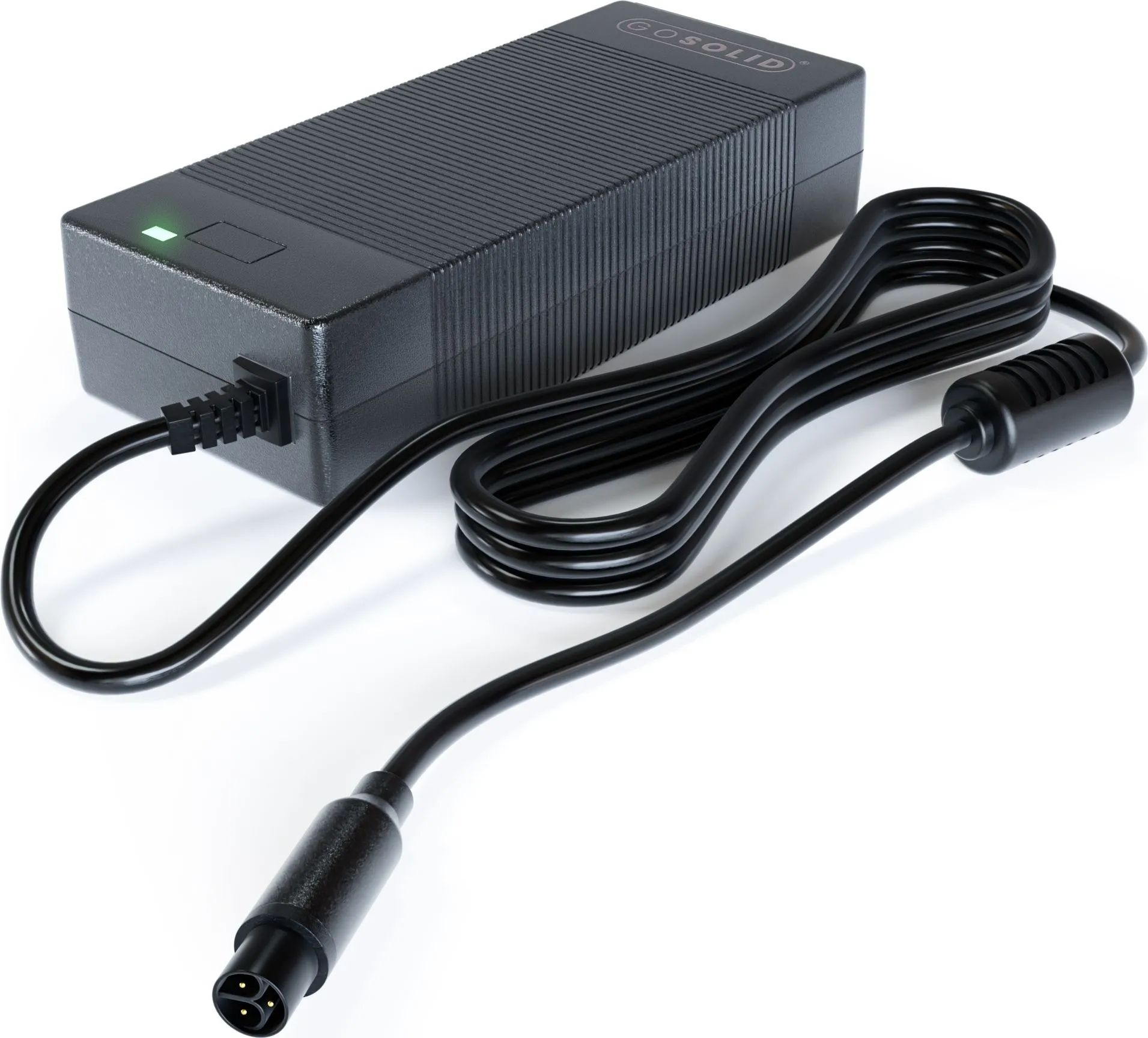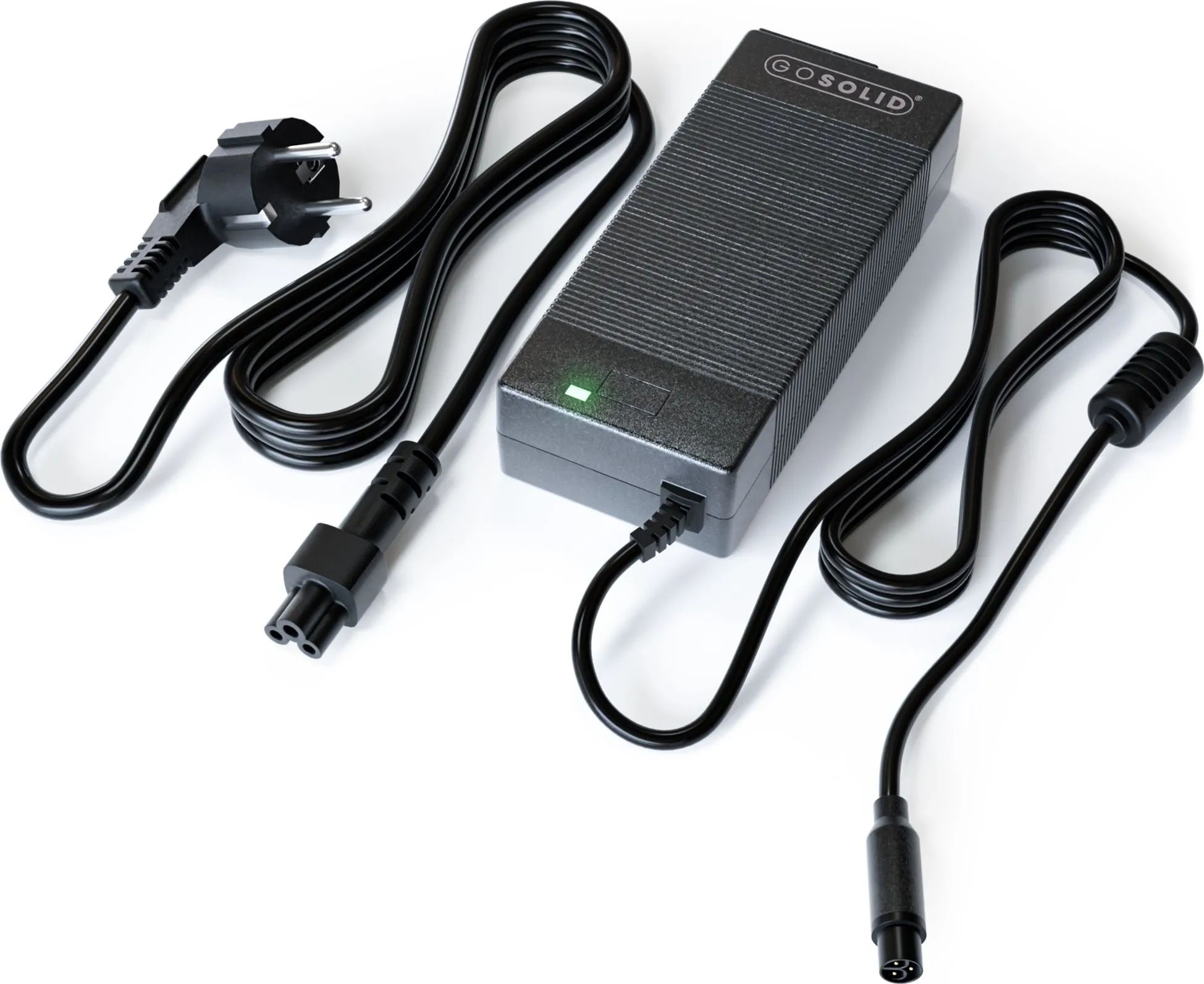 Chargeur GO SOLID! compact 36V 2A avec prise 3 broches, parfait comme chargeur de remplacement pour batteries Brinckers Intube. Charge efficace avec protections contre la surcharge et les courts‑circuits et voyants LED. Design léger et peu encombrant pour vélos électriques et appareils mobiles. Compatible avec Brinckers Intube.