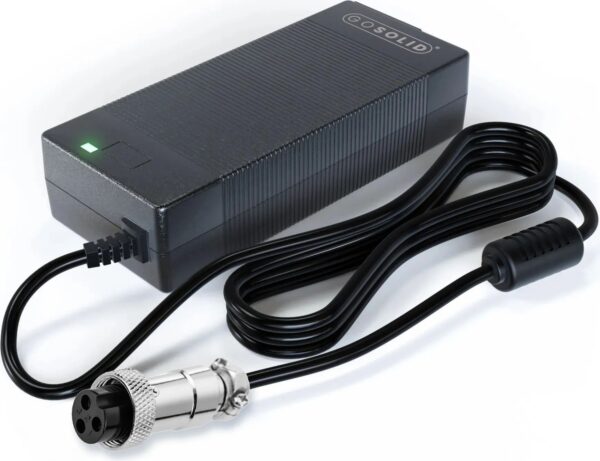 Chargeur GO SOLID! compact et robuste pour vélo électrique. Compatible avec Koolux X9. Charge rapide et fiable avec protections contre les surtensions, les surintensités et les courts-circuits. Idéal comme chargeur de remplacement ou d'appoint, livré avec câble de charge, branchez et utilisez.